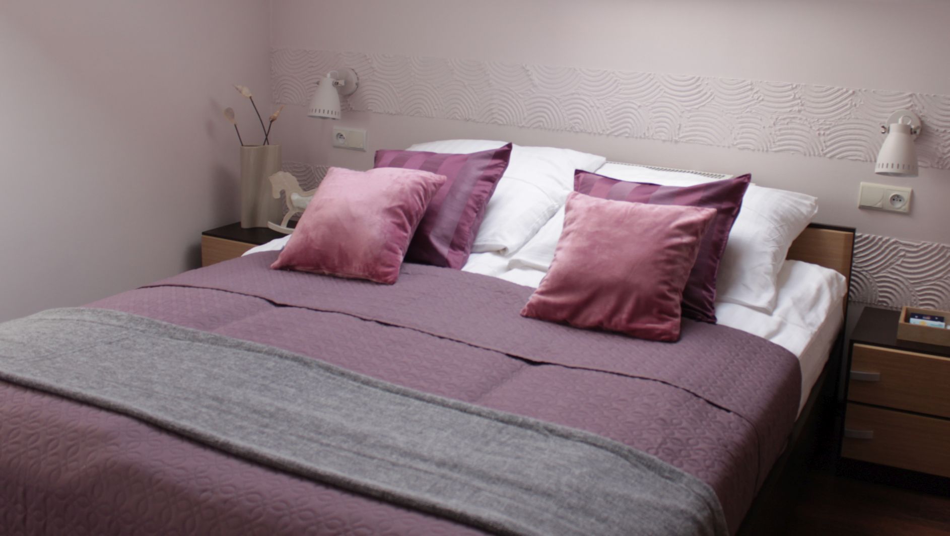sypialnia: łoże małżeńskie, stoliki nocne, lampki nocne,