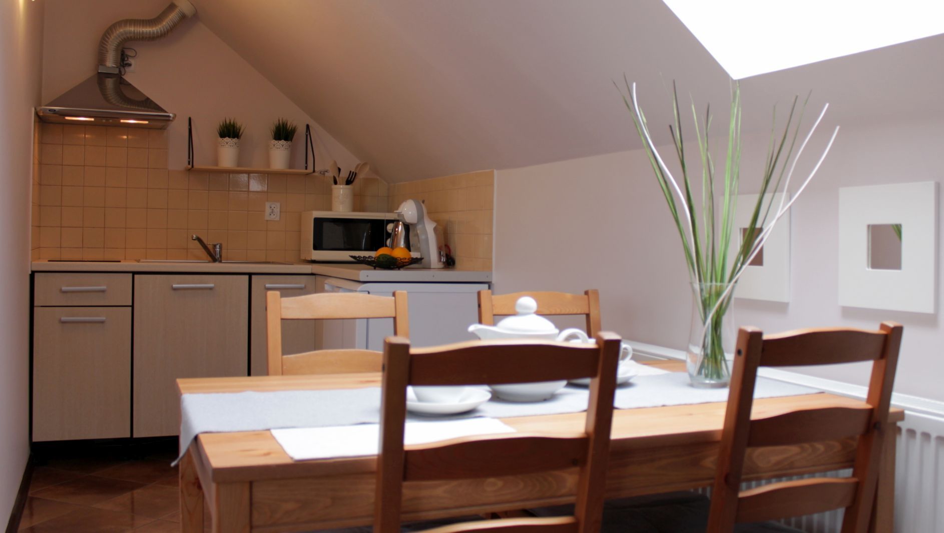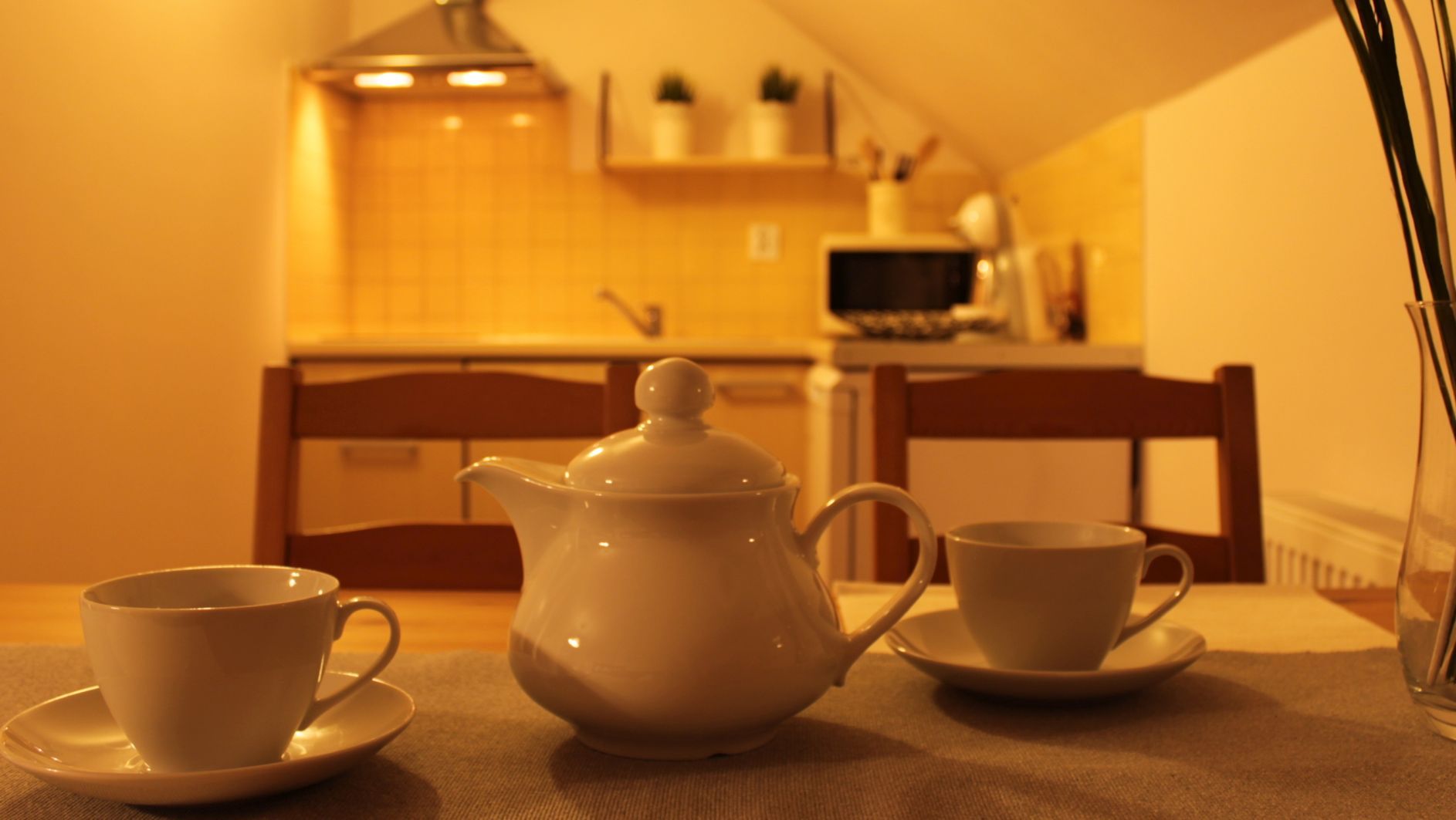 aneks kuchenny (płyta ceramiczna, zlewozmywak, lodówka, kuchenka mikrofalowa, stół kuchenny, czajnik, garnki, patelnia, zastawa stołowa)