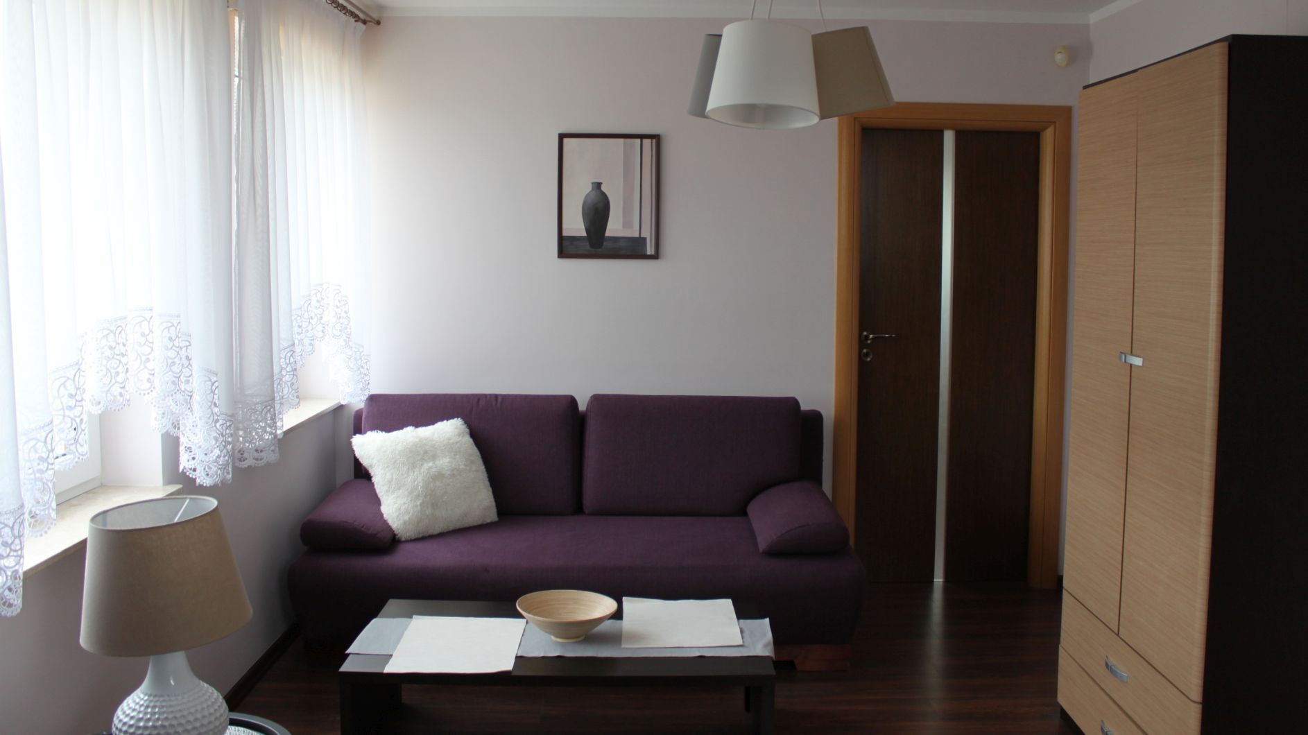 pokój dzienny (2 rozkładane kanapy, szafa, komoda, TV LCD 32", stolik kawowy)