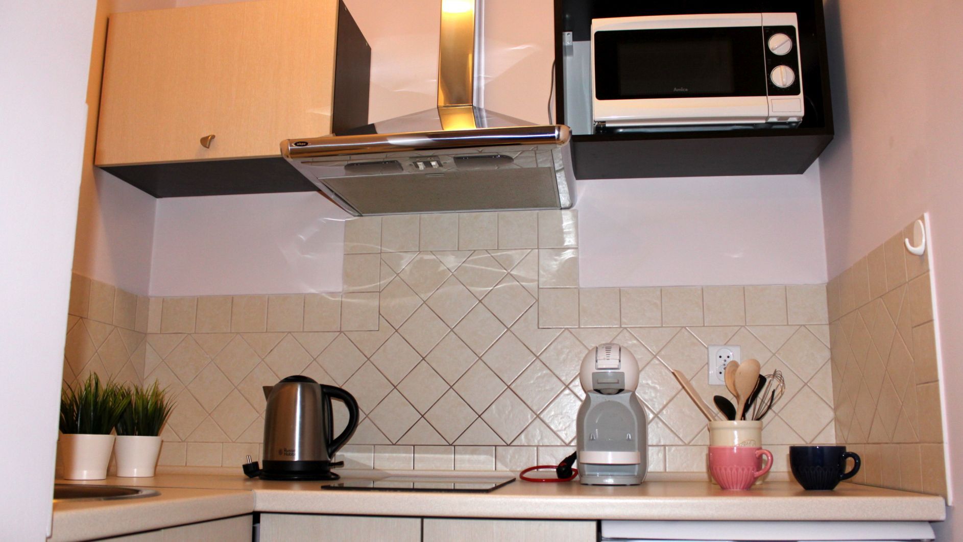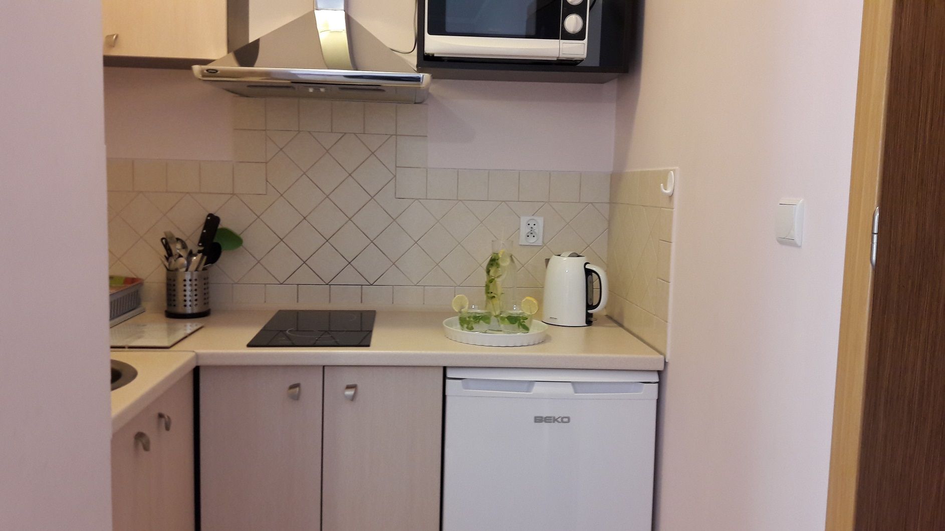 aneks kuchenny (płyta ceramiczna, zlewozmywak, lodówka, kuchenka mikrofalowa, czajnik, garnki, patelnia, zastawa stołowa)