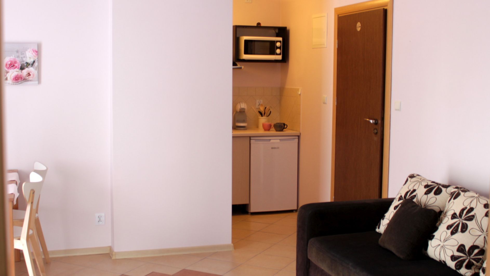 1 APARTAMENT - 4-osobowy o pow. 28m2 jednopokojowy, z aneksem kuchennym, łazienką, wydzielonym miejscem do spania.