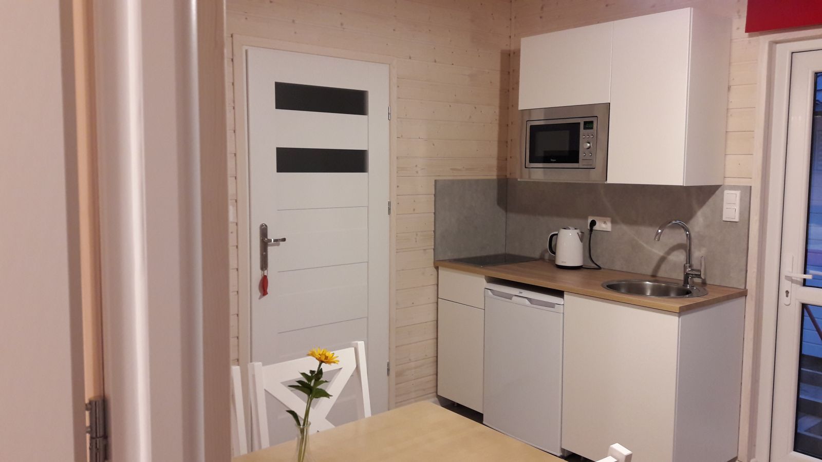 Aneks kuchenny: płyta ceramiczna, lodówka, zlewozmywak, mikrofalówka, czajnik elektryczny,komplet naczyń
