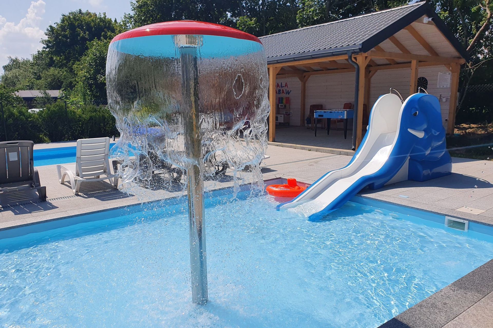 Na terenie Ośrodka plac zabaw z atestem bezpieczeństwa, bujak, huśtawki, trampolina; BASEN