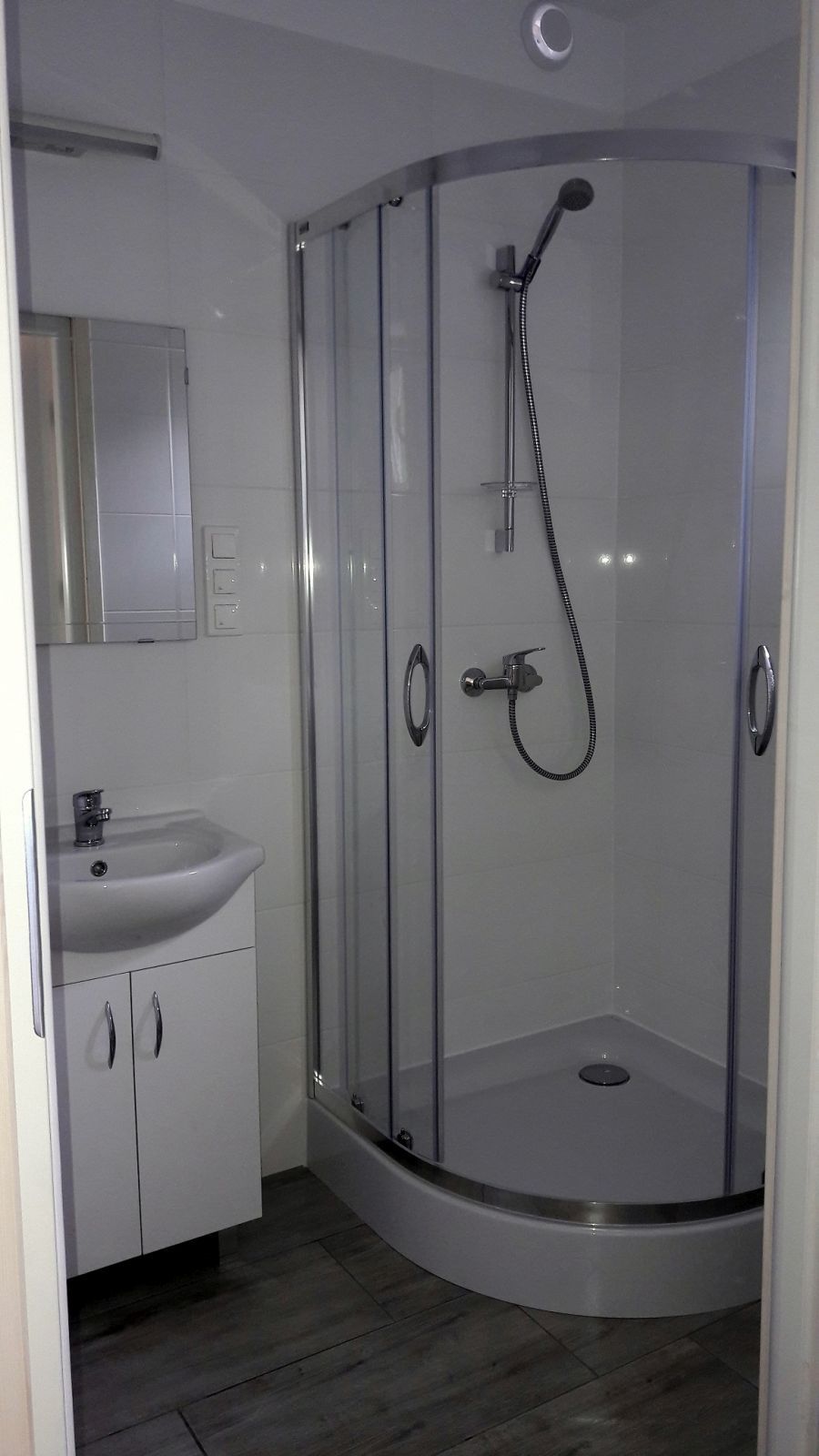 Łazienka: kabina prysznicowa, umywalka, toaleta.