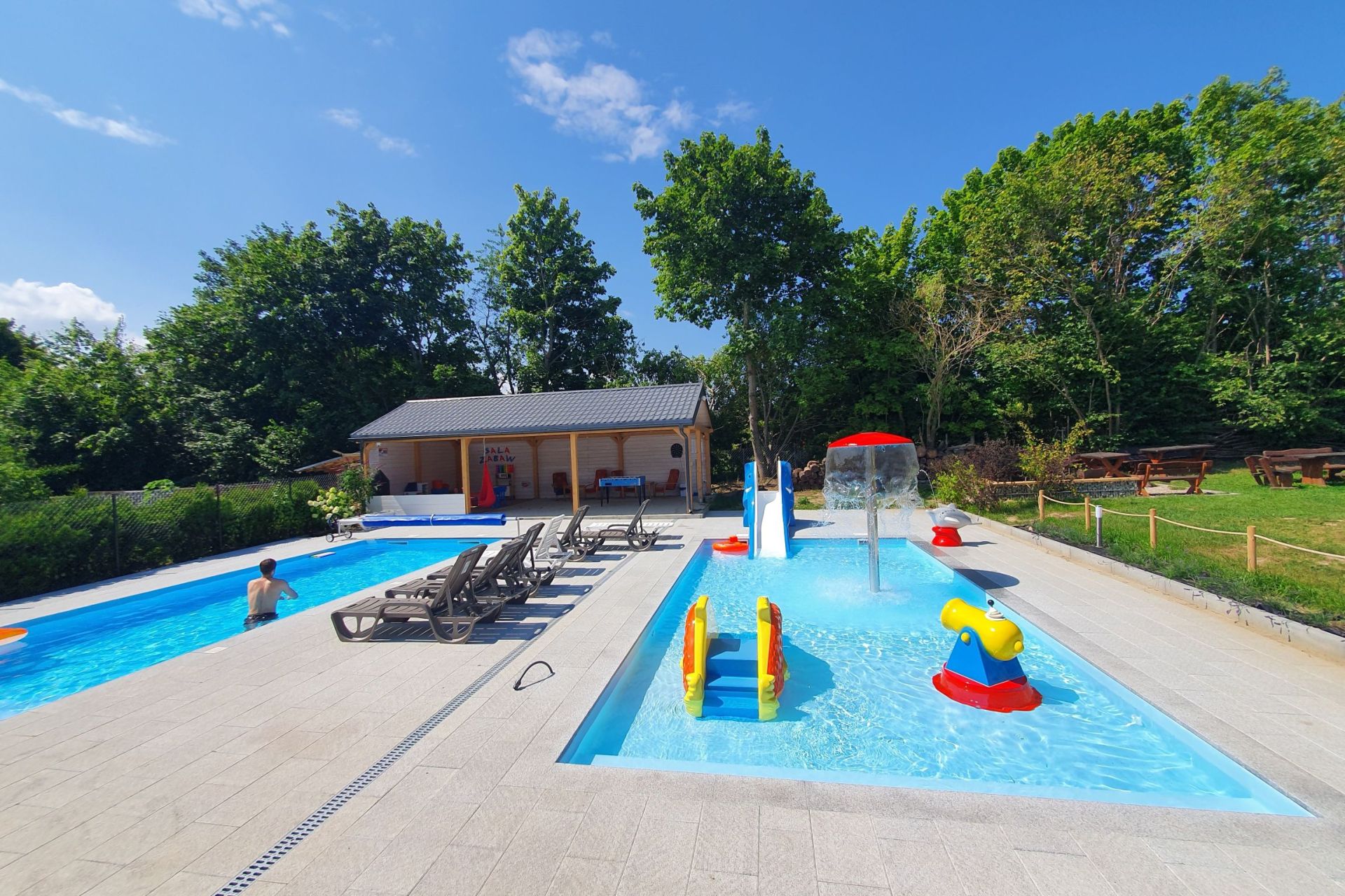 Na terenie Ośrodka plac zabaw z atestem bezpieczeństwa, bujak, huśtawki, trampolina; Odkryty Basen z podgrzewaną wodą 1,2m głęboki z hydromasażem; brodzik 0,3m głęboki z atrakcjami wodnymi i podgrzewaną wodą; kącik zabaw; piłkarzyki;
