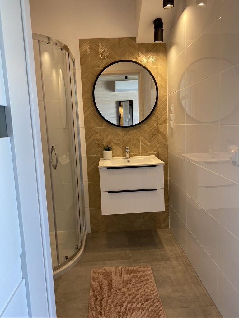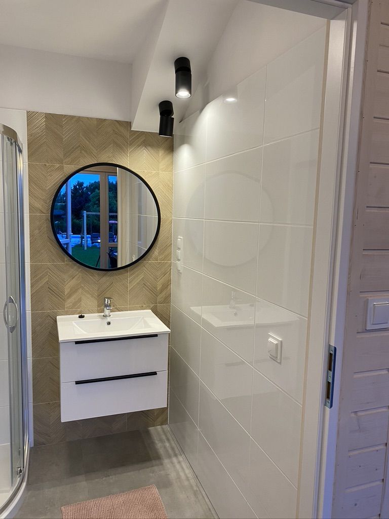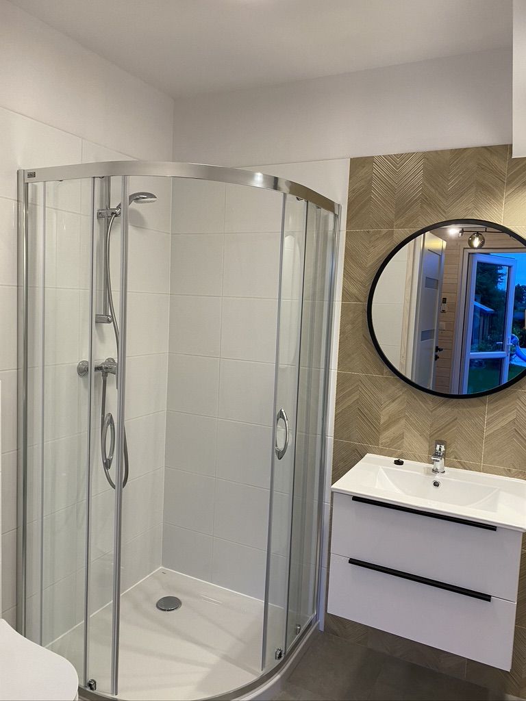 Łazienka: kabina prysznicowa, umywalka, toaleta.