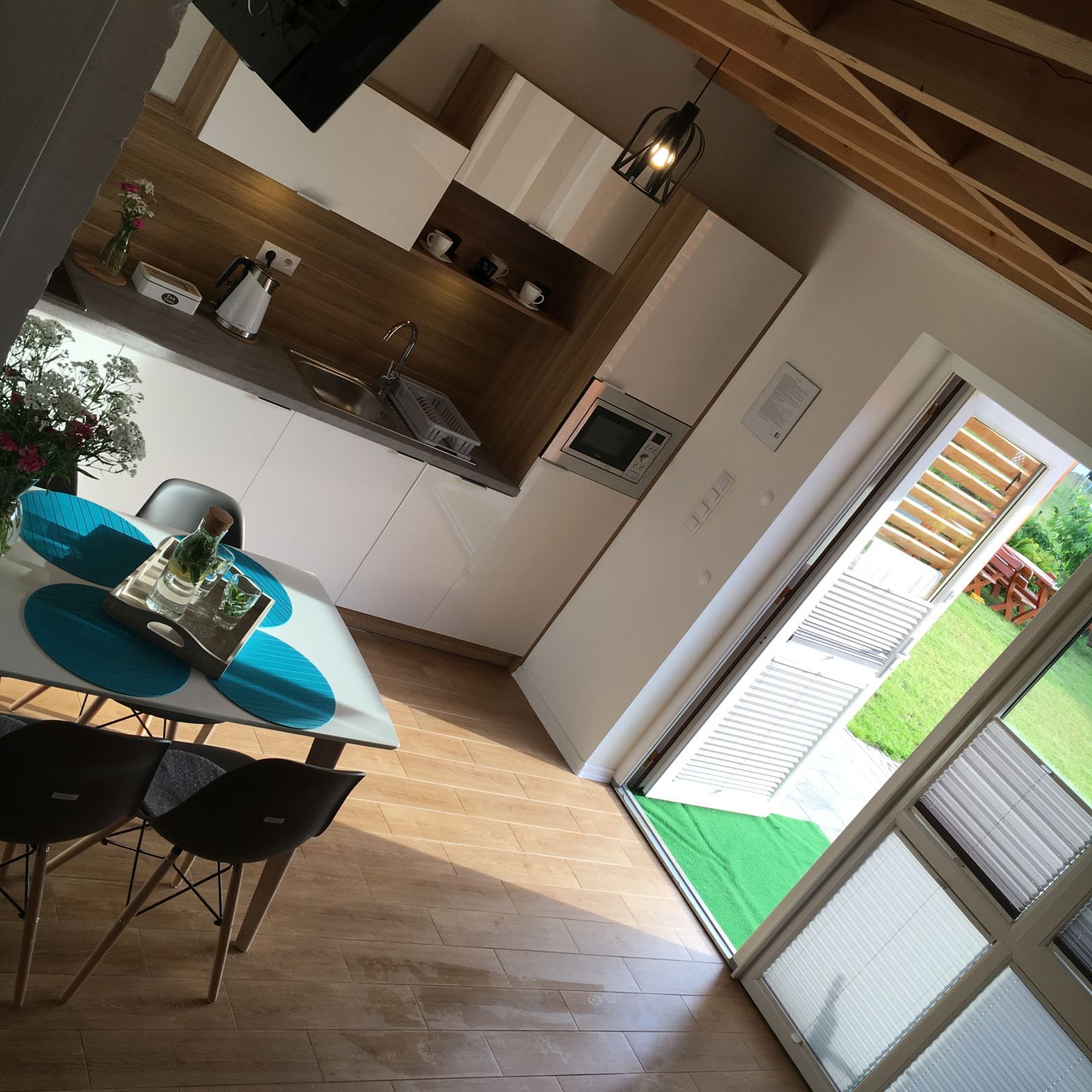 Parter to część wypoczynkowa - z wygodną sofą z funkcją spania oraz z dobranymi ze szczególną starannością elementami wyposażenia, TV LED 32"- połączona z kącikiem jadalnym i aneksem kuchennym, gdzie znajdziecie Państwo ekspress do kawy na kapsułki Nescafe Dolce Gusto z zestawem powitalnym, czajnikiem. Ponadto lodówka, mikrofalówka, zmywarka, pralka, płyta ceramiczna dwupalnikowa, połączone wszystko zabudową kuchenną wykonaną na zamówienie, w której znajdują się wszystkie niezbędne akcesoria kuchenne (zastawa stołowa, sztućce, garnki itp.)