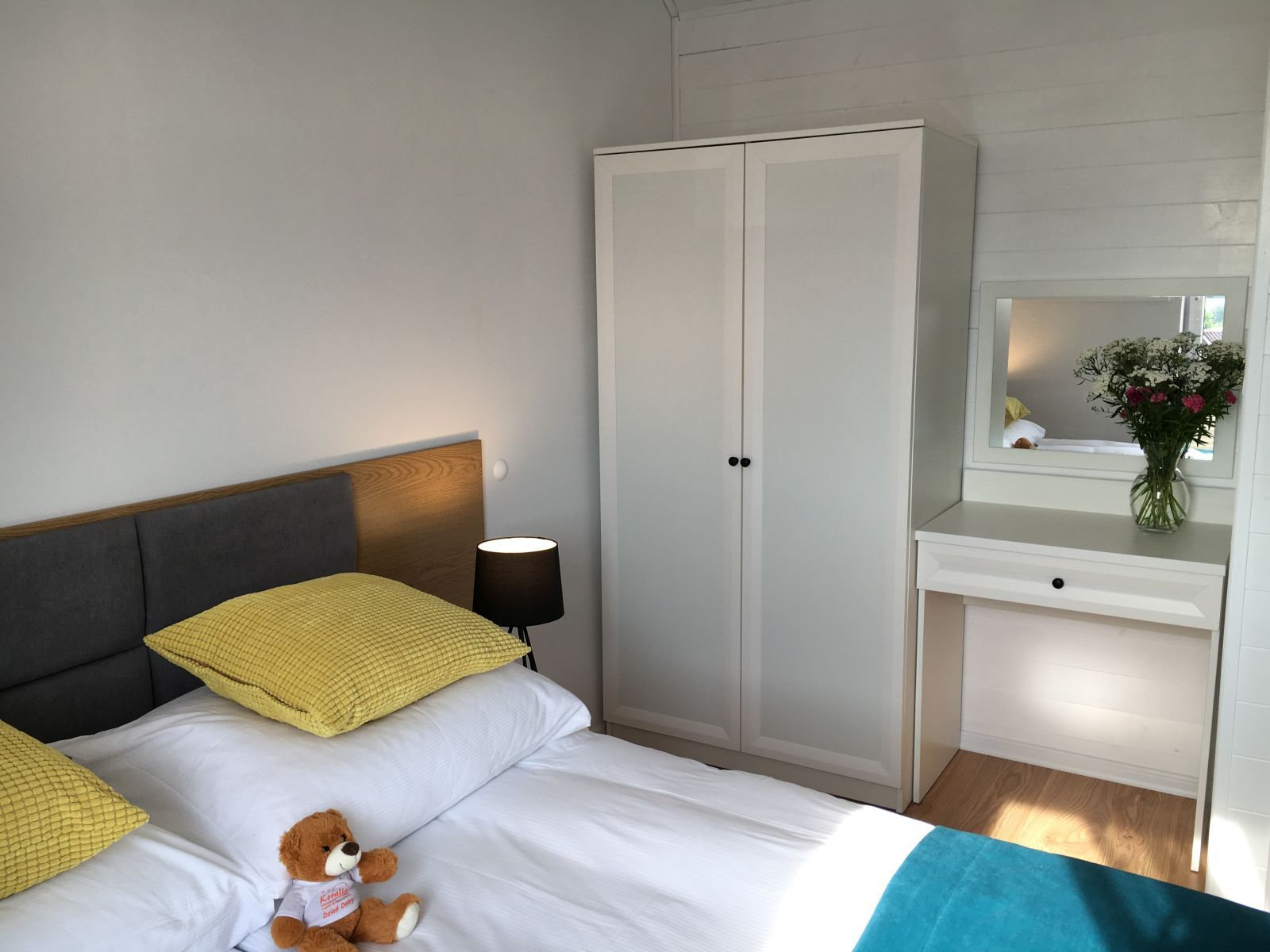 Na piętro prowadzą Państwa wygodne, bezpieczne dwuzabiegowe drewniane schody, gdzie mieszczą się dwie sypialnie. Jedna dla Rodziców z wygodnym łożem małżeńskim 160cm szerokie i miękkim wezgłowiem, stolikami nocnymi z lampkami. Do tego szafa dwudrzwiowa i dla Pań mała toaletka z lustrem. Druga sypialnia to sypialnia dla Dzieci z dwoma pojedyńczymi łóżkami 90cm szerokie z miękkim wezgłowiem, lampkami oraz szafą jednodrzwiową i komodą. Łóżka zasłane są antyalergiczną, hotelową pościelą. Dla bezpieczeństwa Państwa pociech na piętrze przy schodach zamontowaliśmy bramkę z zamknięciem na zewnątrz.