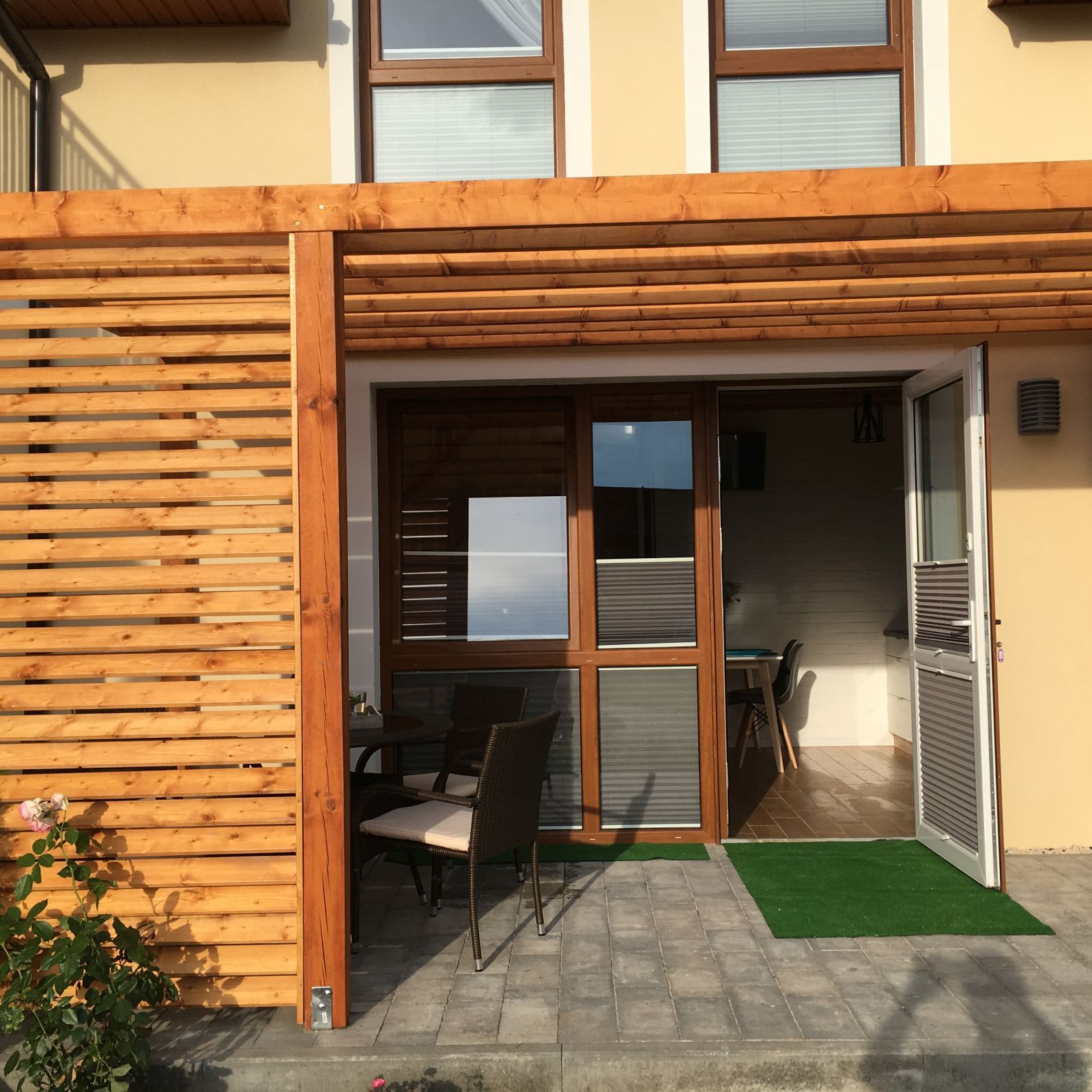 Idealnym rozwiązaniem na upalne dni jest taras wyposażony w nowoczene meble wypoczynkowe. Drewniana zabudowa tarasowa z żaluzjowymi ekranami zapewni Państwu prywatność. Każdy taras ma swoją mała strefę zieleni, by zapewnić Państwu przyjemny odpoczynek.