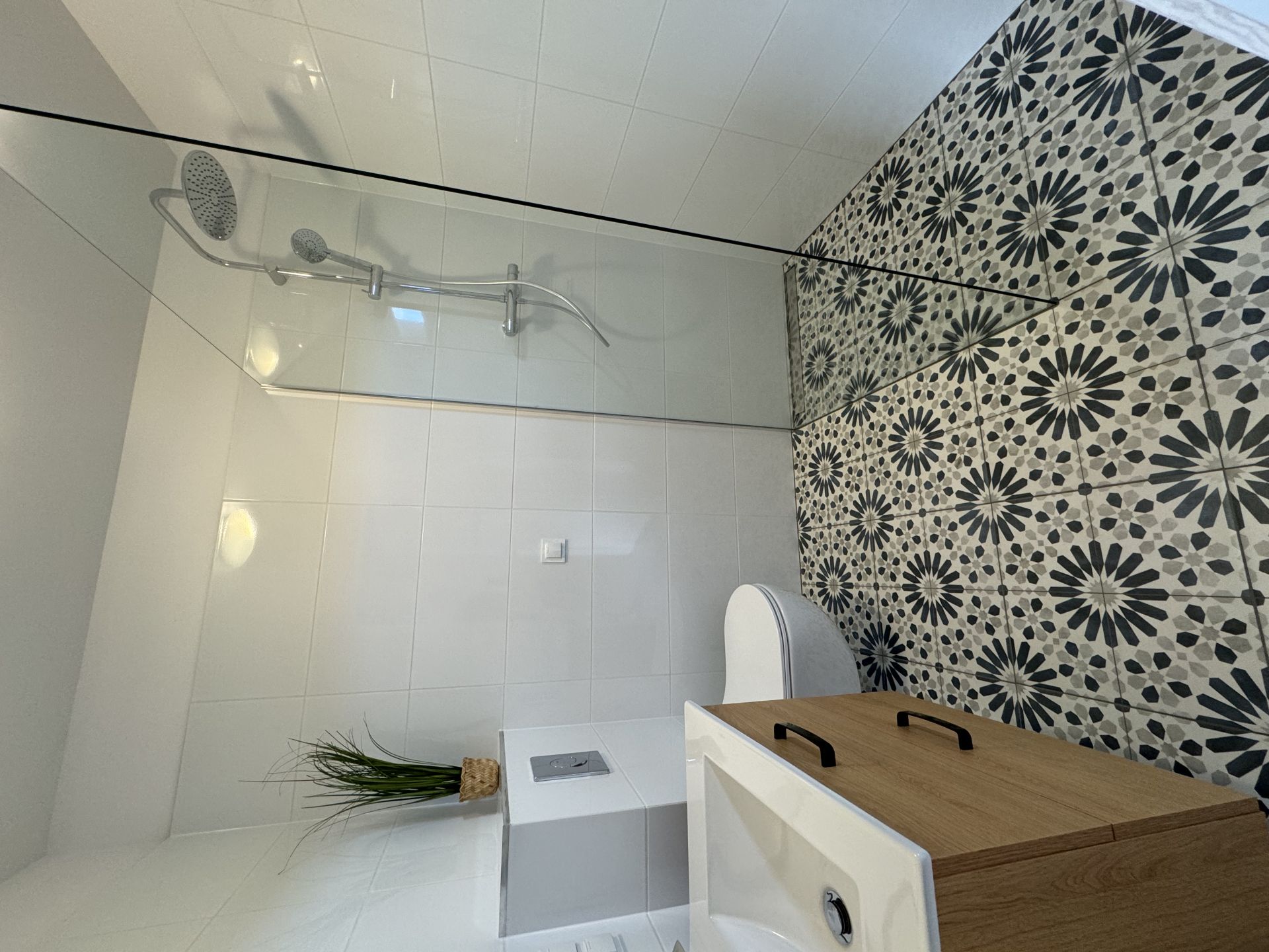 łazienka (WC, kabina prysznicowa typu walk-in, umywalka, duże lustro, suszarka do włosów).
