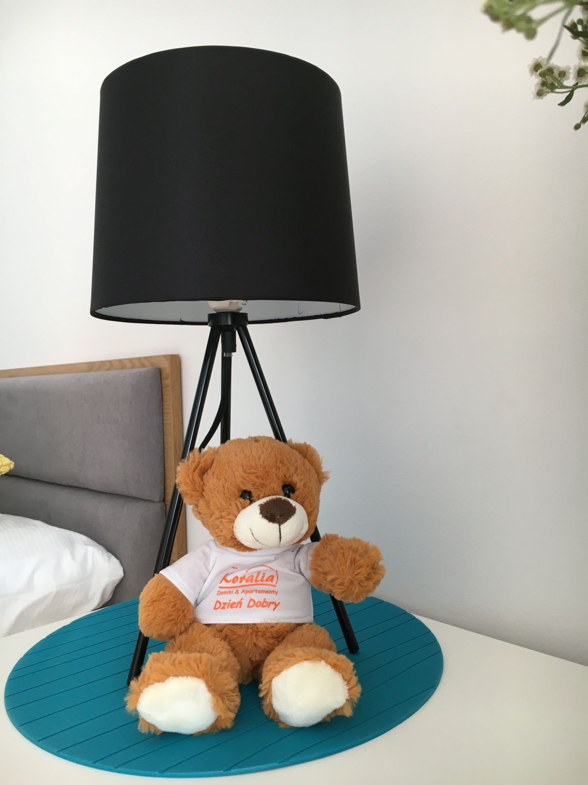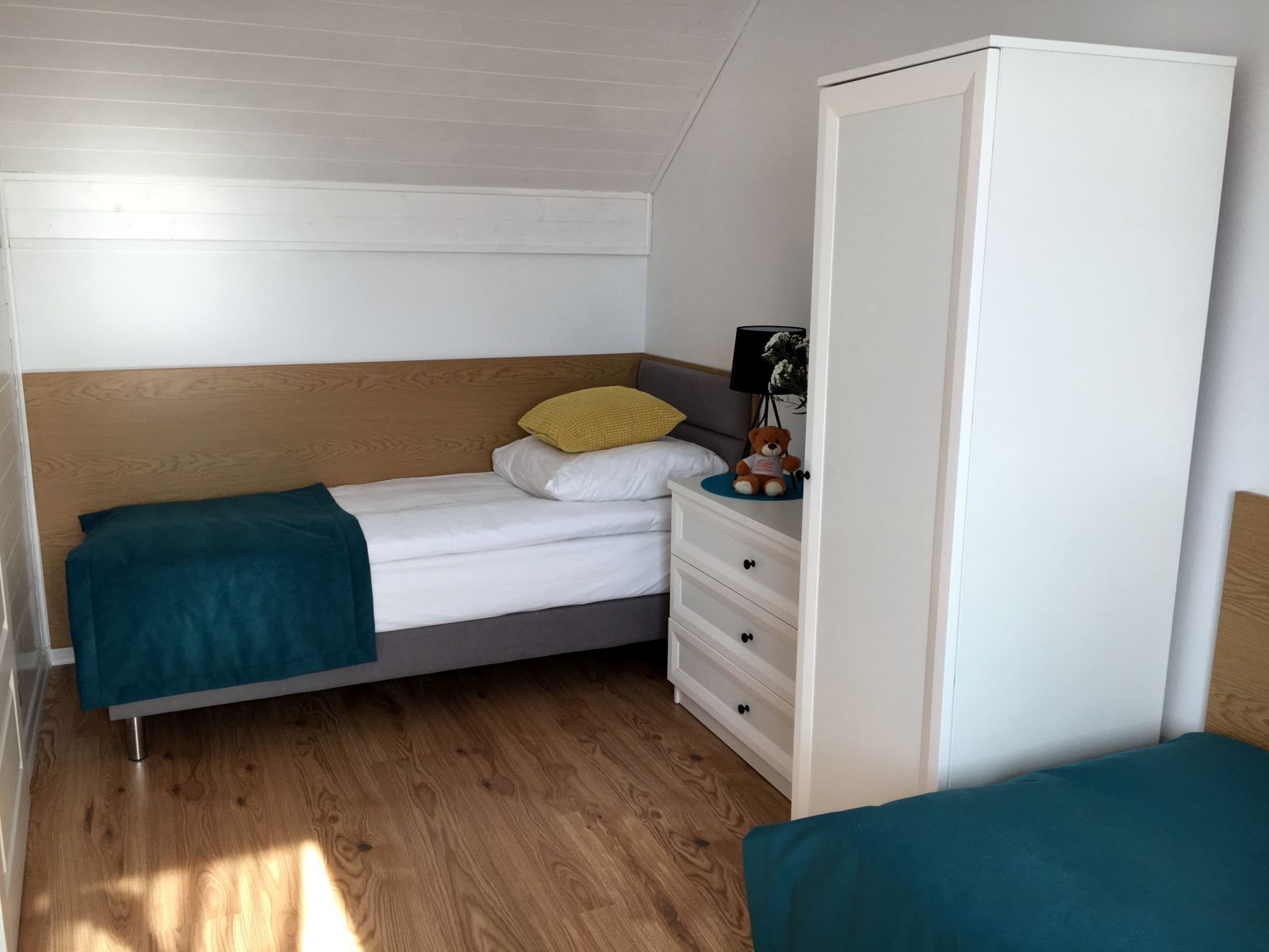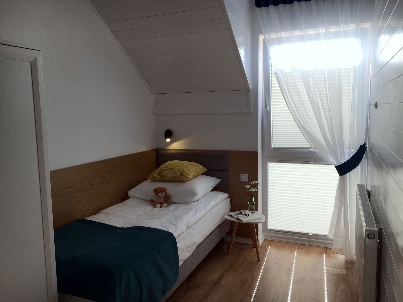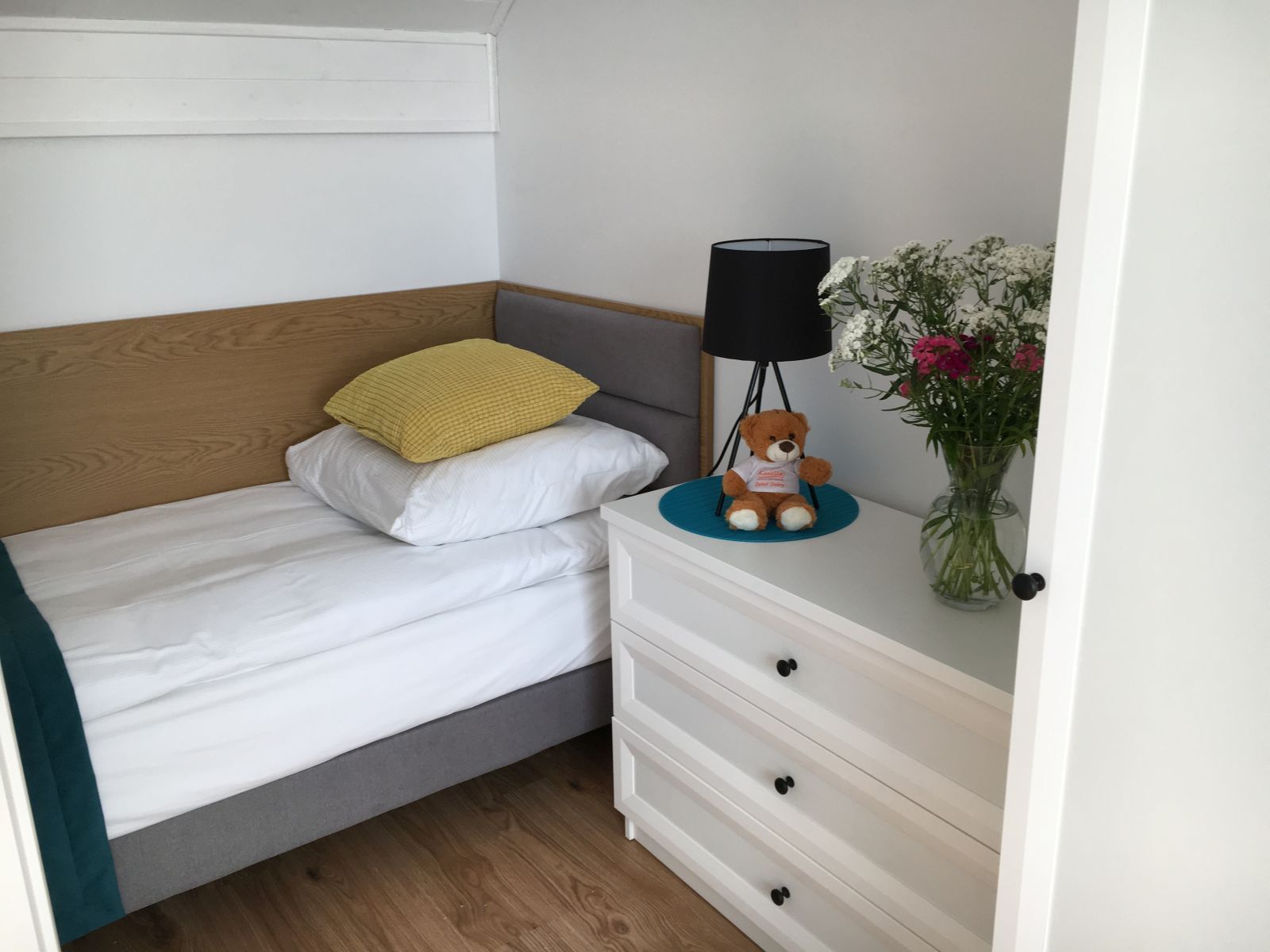 Na piętro prowadzą Państwa wygodne, bezpieczne dwuzabiegowe drewniane schody, gdzie mieszczą się dwie sypialnie. Jedna dla Rodziców z wygodnym łożem małżeńskim 160cm szerokie i miękkim wezgłowiem, stolikami nocnymi z lampkami. Do tego szafa dwudrzwiowa i dla Pań mała toaletka z lustrem. Druga sypialnia to sypialnia dla Dzieci z dwoma pojedyńczymi łóżkami 90cm szerokie z miękkim wezgłowiem, lampkami oraz szafą jednodrzwiową i komodą. Łóżka zasłane są antyalergiczną, hotelową pościelą. Dla bezpieczeństwa Państwa pociech na piętrze przy schodach zamontowaliśmy bramkę z zamknięciem na zewnątrz.