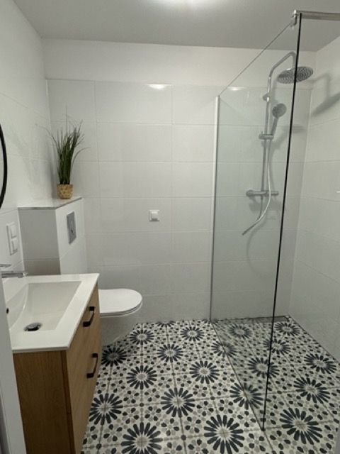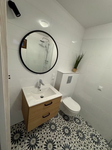 łazienka (WC, kabina prysznicowa typu walk-in, umywalka, duże lustro, suszarka do włosów).